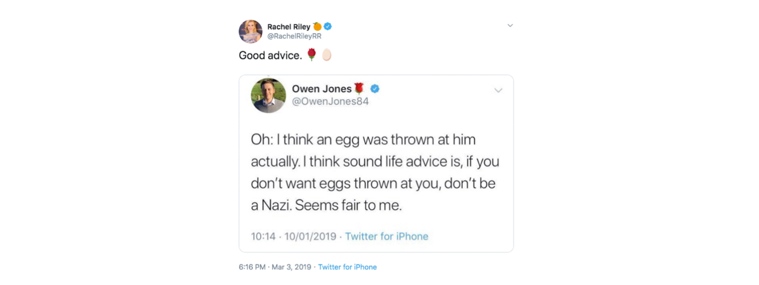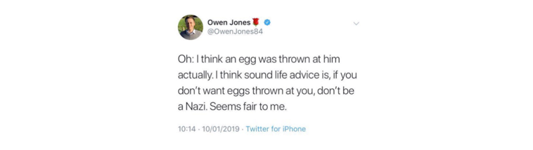 On 10 January 2019, Owen Jones tweeted the following, referring to an incident in which an egg had been thrown at Nick Griffin, the former leader of the British National Party: