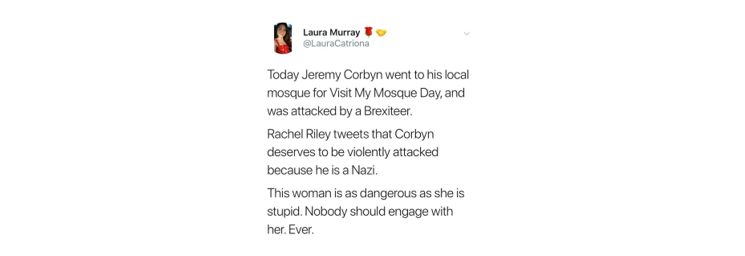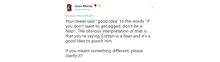 On 3 March 2019, the former Leader of the Labour Party Jeremy Corbyn MP was assaulted with an egg whilst visiting the Finsbury Park Mosque. Shortly after the incident, the television presenter Rachel Riley tweeted as follows (the Good Advice Tweet or GAT):